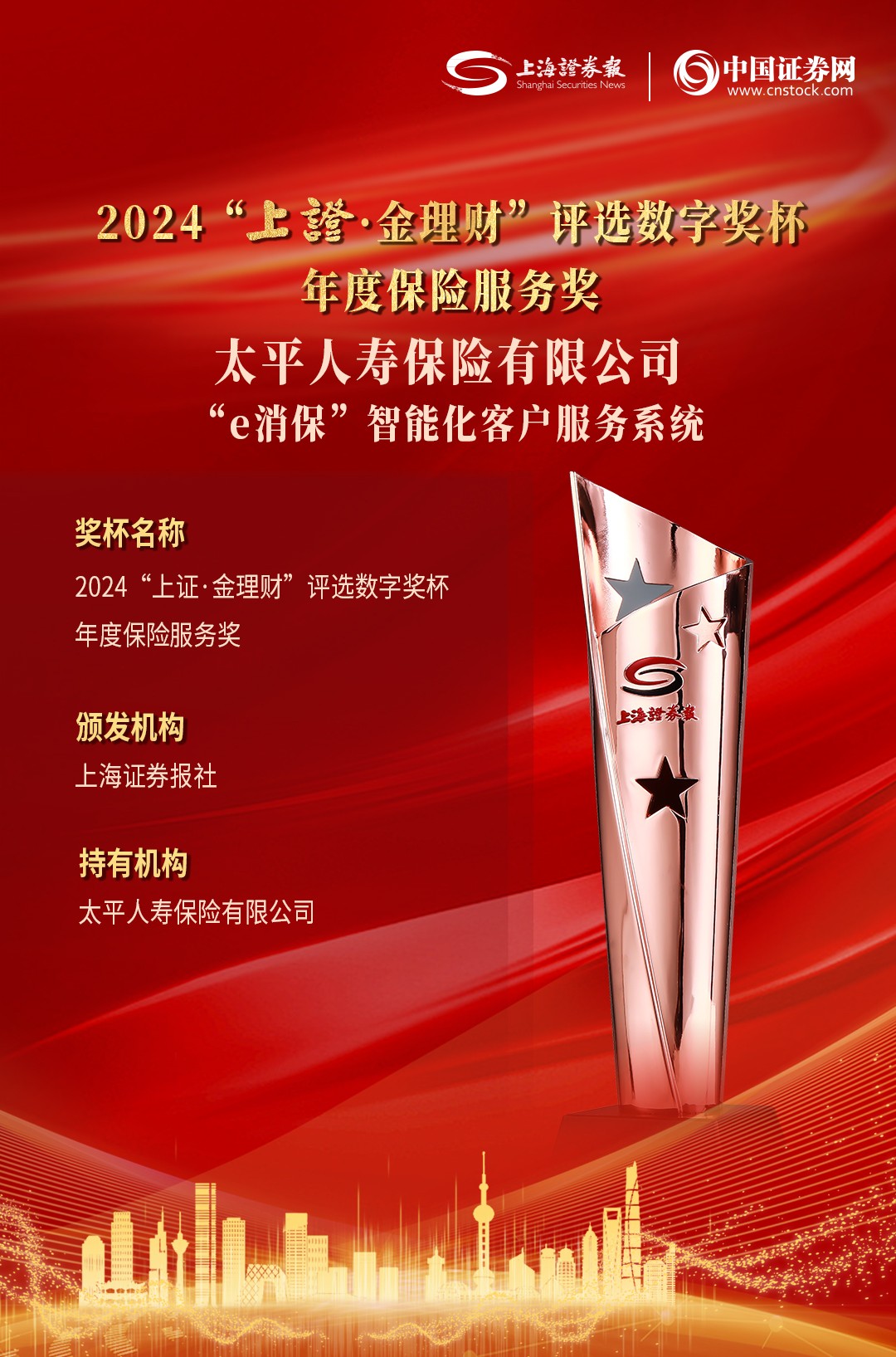 日前,由上海證券報(bào)·中國(guó)證券網(wǎng)主辦的2024“上證·金理財(cái)”評(píng)選頒獎(jiǎng)典禮正式舉辦。太平人壽憑借高質(zhì)量發(fā)展和踐行金融五篇大文章的優(yōu)異成果,在眾多金融品牌中脫穎而出,榮獲年度保險(xiǎn)保障品牌、年度保險(xiǎn)服務(wù)兩項(xiàng)大獎(jiǎng)。