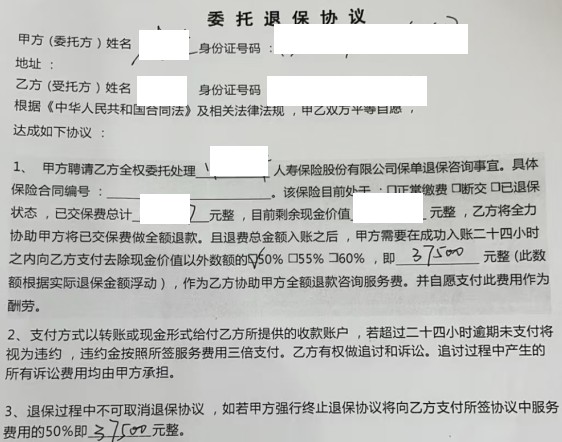起初,李先生與所謂的“某律師”簽訂了一份委托退保協(xié)議,并聽從對方的要求編造虛假理由多方投訴保司。太平人壽工作人員多次邀約客戶面談但均被回絕,為取得客戶的信任,公司申請當(dāng)?shù)氐娜嗣裾{(diào)解委員會出面調(diào)解。在調(diào)解過程中,公司工作人員指出了該委托退保協(xié)議中存在的明顯漏洞——無論退保成功與否客戶都需向?qū)Ψ嚼U納一筆近4萬元的手續(xù)費(fèi)。隨后當(dāng)客戶撥通電話質(zhì)問這位“律師”時,對方果然原形畢露,并威脅將依據(jù)該協(xié)議內(nèi)容上門追討。最終,客戶選擇報警處理,同時感謝太平人壽和調(diào)解員的耐心勸導(dǎo),并辦理了保單復(fù)效手續(xù)。