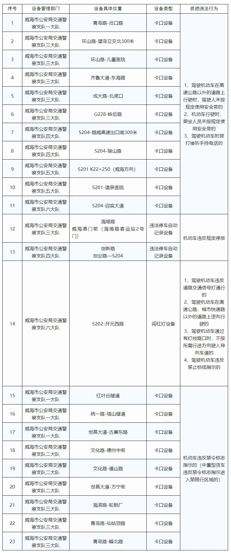 為保障道路交通安全,預(yù)防和減少交通事故的發(fā)生,根據(jù)《中華人民共和國(guó)道路交通安全法》及其實(shí)施條例等法律法規(guī)和相關(guān)技術(shù)規(guī)范的規(guī)定,依據(jù)《公安機(jī)關(guān)執(zhí)法公開規(guī)定》,現(xiàn)將新增的23處交通技術(shù)監(jiān)控設(shè)備予以公示,自2024年12月1日起,將對(duì)有關(guān)交通違法行為進(jìn)行依法管理,請(qǐng)廣大道路交通參與者自覺(jué)遵守相關(guān)法律法規(guī),共同維護(hù)良好的道路交通秩序。