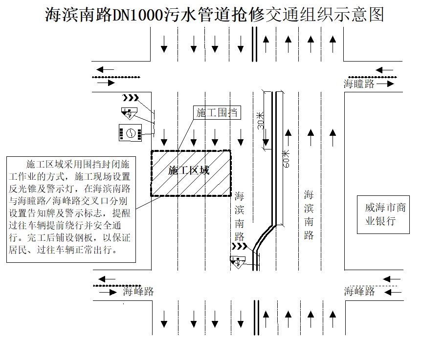 二、占用道路:施工期間封閉占用海濱南路與海瞳路紅綠燈向南40米處西半幅非機(jī)動(dòng)車道及三條機(jī)動(dòng)車道,海濱南路西半幅保留兩條機(jī)動(dòng)車道通行,海濱南路東半幅保留三條機(jī)動(dòng)車道通行,請(qǐng)過(guò)往行人、車輛減速慢行,注意安全。因施工給您帶來(lái)不便,敬請(qǐng)諒解。