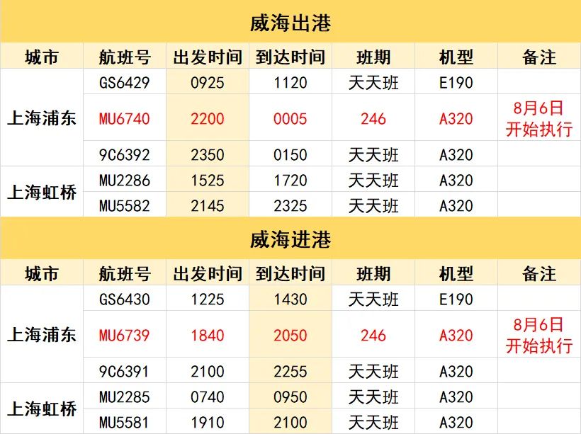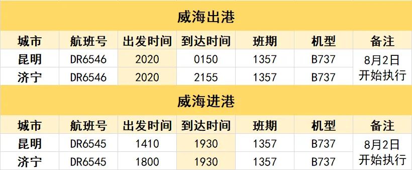 8月2日起 開通“威海-濟寧-昆明”航線,8月6日起 加密“威海-上海”航線
