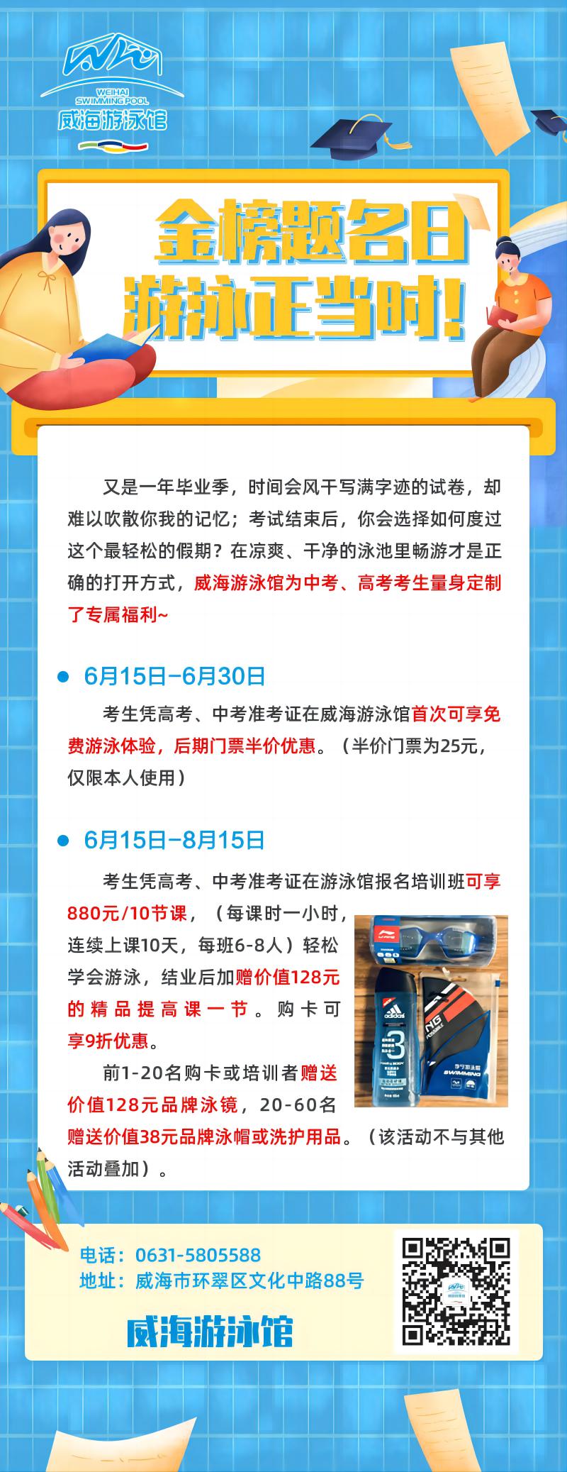 6月15日-6月30日考生憑高考、中考準(zhǔn)考證在威海游泳館首次可享免費游泳體驗,后期門票半價優(yōu)惠。(半價門票為25元僅限本人使用)