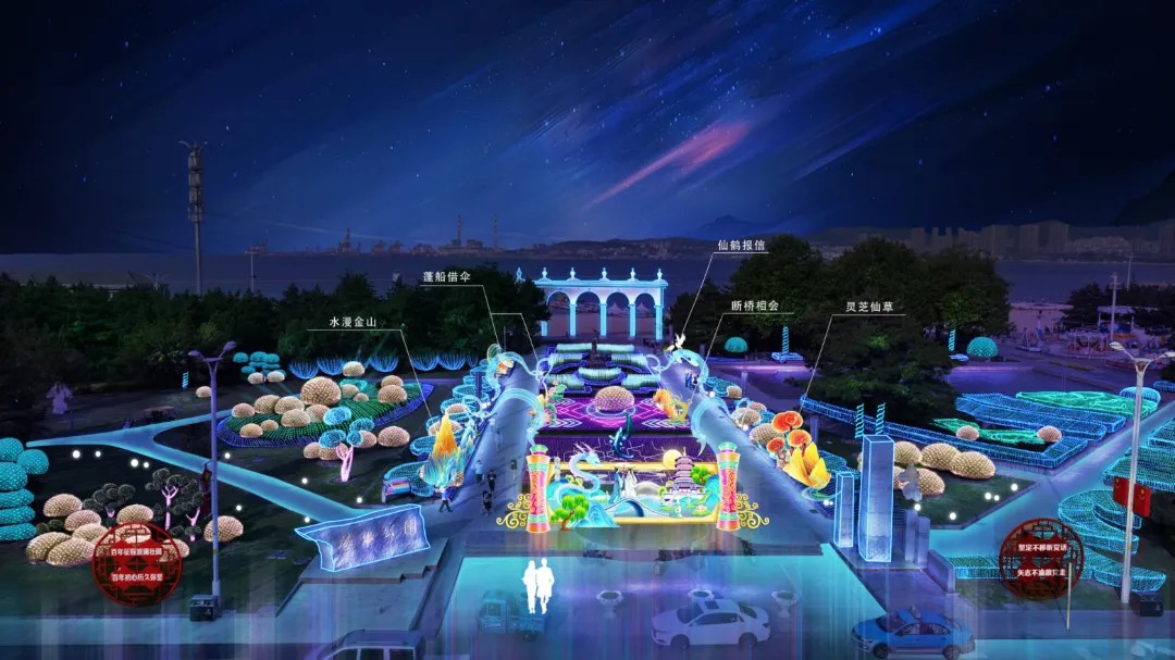 高區(qū)在高新廣場(chǎng)布置一組“山海畫(huà)卷”立體景觀(guān),主體造型以卷軸為本,以海洋文化為題材,融入海洋動(dòng)植物、浪花、祥云、海鷗等元素。廣場(chǎng)四周樹(shù)木、草坪上采取紅燈籠、水母燈、詩(shī)詞燈柱、網(wǎng)燈等燈飾和“毛衣樹(shù)”裝飾進(jìn)行全方位裝點(diǎn),達(dá)到晝夜皆景。同時(shí),在世昌大道、文化路、環(huán)海路、火炬八街等重要路段和重要節(jié)點(diǎn)的行道樹(shù)上懸掛燈籠,綠地里布置燈飾。