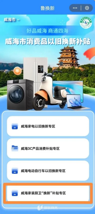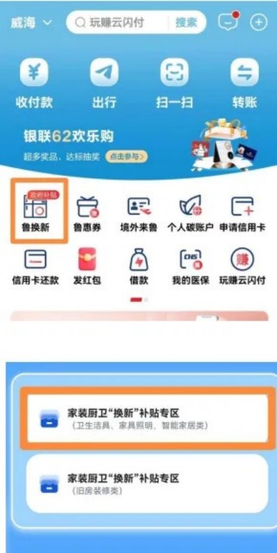 1.登錄平臺。打開云閃付App升級至最新版本,打開手機定位功能,并允許獲取位置信息。確認首頁左上角的位置為“威海市”,在云閃付App搜索進入“魯換新”小程序。點擊左上角“請選擇地市”,在下拉菜單中選擇“威海市”,點擊確認,進入威海家裝廚衛(wèi)“煥新”補貼專區(qū)(衛(wèi)生潔具、家具照明、智能家居類)。
