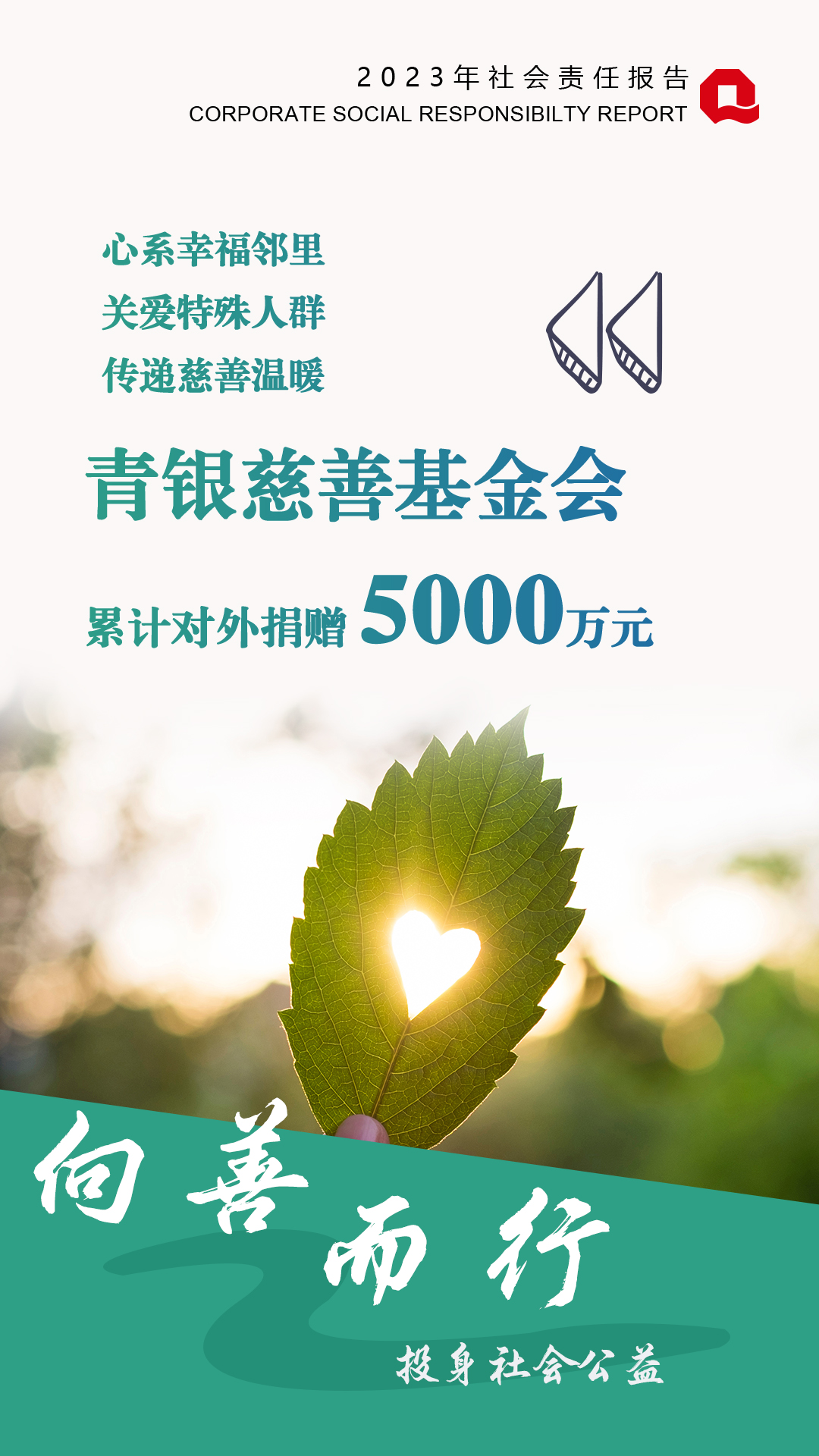 作為地方法人銀行,青島銀行始終秉持回饋社會(huì)的理念,積極投身公益事業(yè),不斷書寫“人民金融”的新篇章:“幸福鄰里”深入社區(qū),開展“黨建+志愿”活動(dòng)718場(chǎng),讓群眾感受“不一樣”的金融服務(wù),受眾達(dá)5.53萬人;關(guān)愛特殊人群,“青馨服務(wù)”再向前一步,銀發(fā)服務(wù)交出溫情答卷,“青馨工作室”獲中國(guó)金融工會(huì)“全國(guó)創(chuàng)新工作室”命名表彰;青銀慈善基金會(huì)傳遞慈善溫暖,積極開展捐資助學(xué)、扶弱濟(jì)貧、綠色公益、美麗鄉(xiāng)村建設(shè)等公益活動(dòng)。2023年,青島銀行、青銀慈善基金會(huì)合計(jì)對(duì)外捐贈(zèng)367萬元,榮獲“青島紅十字博愛金獎(jiǎng)”、《大眾日?qǐng)?bào)》“2023年社會(huì)責(zé)任企業(yè)”榮譽(yù)稱號(hào)。