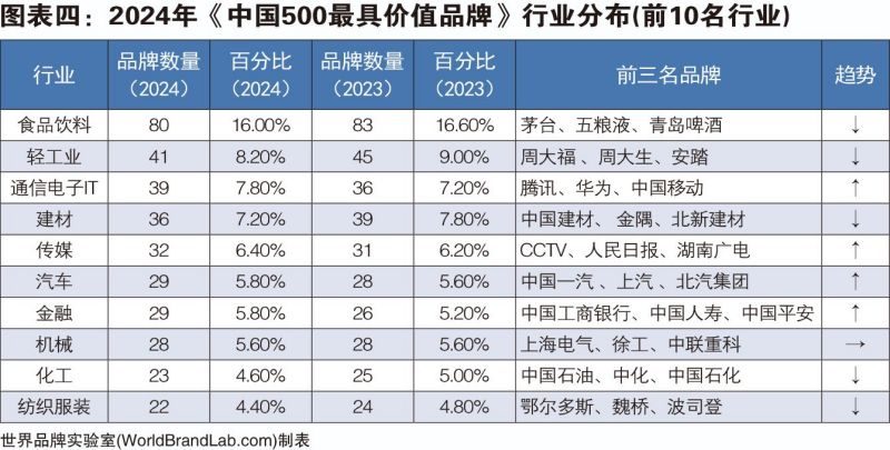 本年度《中國500最具價值品牌》排行榜中,共有來自食品飲料、輕工業(yè)、建材、傳媒、紡織服裝、醫(yī)藥、機(jī)械等在內(nèi)的24個相關(guān)行業(yè)的品牌入選。其中食品飲料業(yè)依然是入選品牌最多的行業(yè),共有80個品牌入選,占總?cè)脒x品牌數(shù)的16.00%;入選數(shù)量位居第二到第五的行業(yè)分別是輕工(41個)、通信電子IT(39個)、建材(36個)、傳媒(32個)。在衡量品牌的忠誠度時,世界品牌實(shí)驗(yàn)室參考了我信品牌(iTrust Rating)的評級數(shù)據(jù);在衡量品牌的領(lǐng)導(dǎo)力特別是ESG(環(huán)境、社會和治理)評分時,參考了超級財經(jīng)(SuperFinance)的ESG數(shù)據(jù)庫。同時還借用了低碳國際(Carboncare International)對品牌企業(yè)碳排放的計量,以推動品牌添加“碳排放評分”標(biāo)簽。